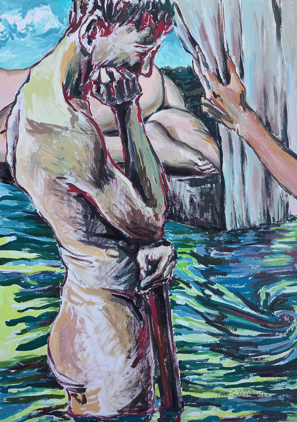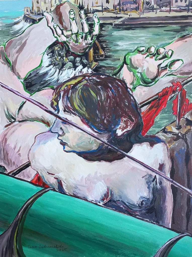 The artist approaches this exploration almost as an observer of places where time compresses, flows, and transforms. Her paintings pulse with movement: breaking waves, falling bodies, gusts of wind, and figures searching for shelter. These events feel both immediate and distant, as if emerging from a world balanced on a threshold — geographical, emotional, or temporal.